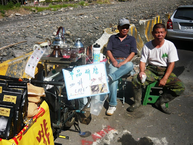 A well deserved rest day to allow recovery both physically and mentally is vital, especially in this cosy holiday villa .The past 6 days of continious cycling and most of it in the mountains , has more or less strengthen up my leg muscles and overall conditions. So far , the mood is right , the recumbent is good , no injuries , the people i met were friendly and helpful , whatsmore can a touring cyclist ask for? With my batteries fully charged and dirty clothes washed in the washing machines done , It is time to take a walk around. I went up to the Kuan Ying waterfall , about 200m from the hotel. The waterfall entrance just beside the road and has walk up wooden platforms and laid stones built for tourists to follow,a clear stream was flowing down obviously from the waterfall up on the hill. It took me 30 min to reach but the 50m waterfall sort of missing in strenght most properly due to no rain for the past weeks. Returned back to hotel and nothing much to do, I did a cleaning on the bike,oiled the chain and overall checking for damages or loose parts.Later I was surprise to receive a call from my B2P (beijing2paris) friends from Taichung and told me they are driving down here to meet me. These 3 friends have cycled from Beijing to Paris but follow different route, 3 weeks after me, Heather and Ulla on 10th Apr 2007.I was originally planned to cycle in Taichung to meet them ,but my plan changed and they took the trouble to meet me here. They arrived at 6pm and we had a delicious dinner at the hotel restauran. We exchanged B2P stories and one of them Hong Ping helped me to true up the rearwheel spokes